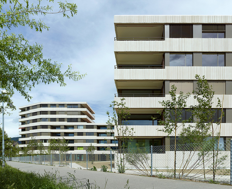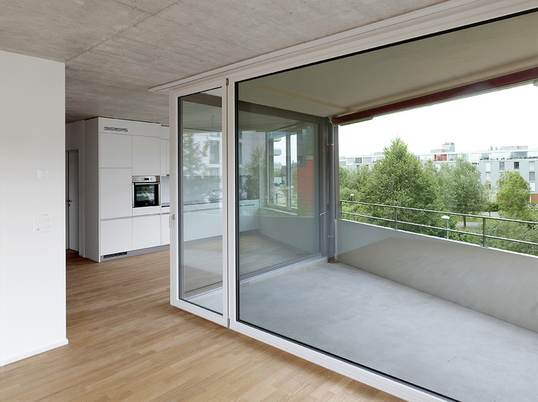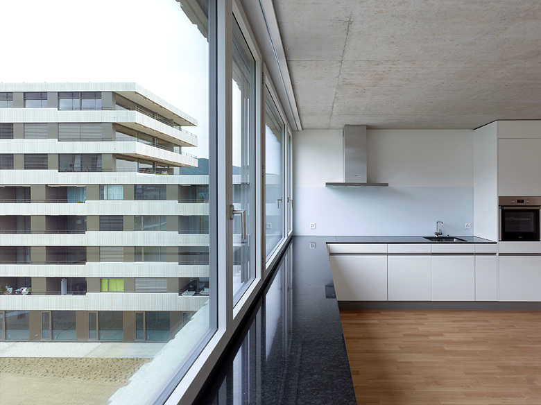 Die Wohnungen sind grossmehrheitlich mit gebäudequerenden, durchgehenden Wohn- Essbereichen konzipiert. Damit profitieren diese von den jeweiligen Aussenräumen. Durch einen Versatz wird der Wohn-, Ess- und Kochbereich gegliedert. Die Ost-West ausgerichteten Wohnungen an der Jurastrasse haben einen zum Grünraum an der Schüss orientierte Loggia.