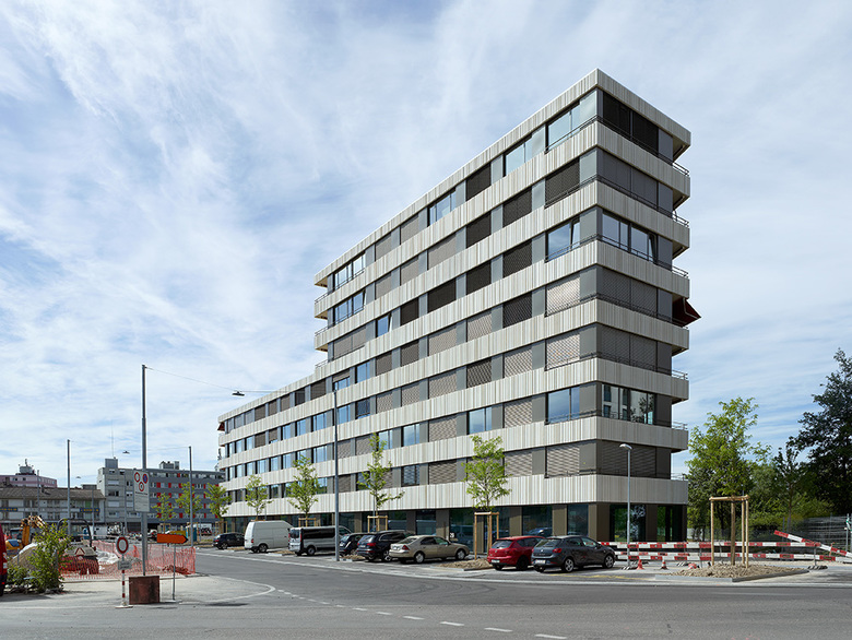 Der mehrfach abgeknickte, winkelförmige Baukörper gliedert sich in einen 8-geschossigen, Ost-West orientierten Gebäudetrakt entlang der Jurastrasse und einen in Nord-Süd ausgerichteten 5-geschossigen Baukörper welcher sich in den Parkraum erstreckt. Mit dem 8-geschossigen Baukörper wird das Areal räumlich gegen den Güterbahnhof abgeschlossen und reagiert gleichzeitig auf den nördlich situierten Bau des Schüss Sei.