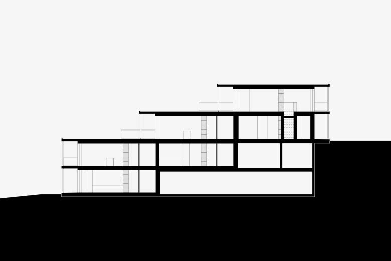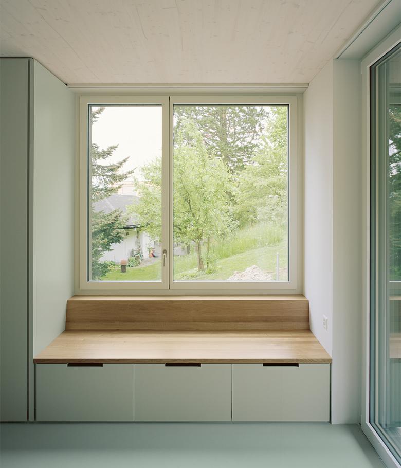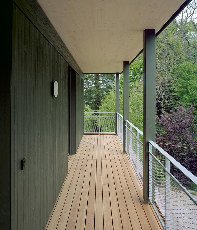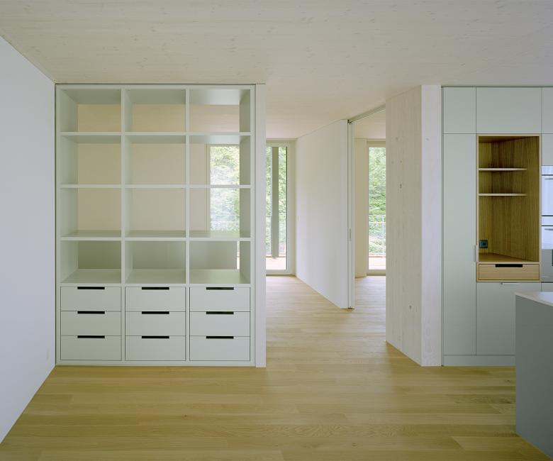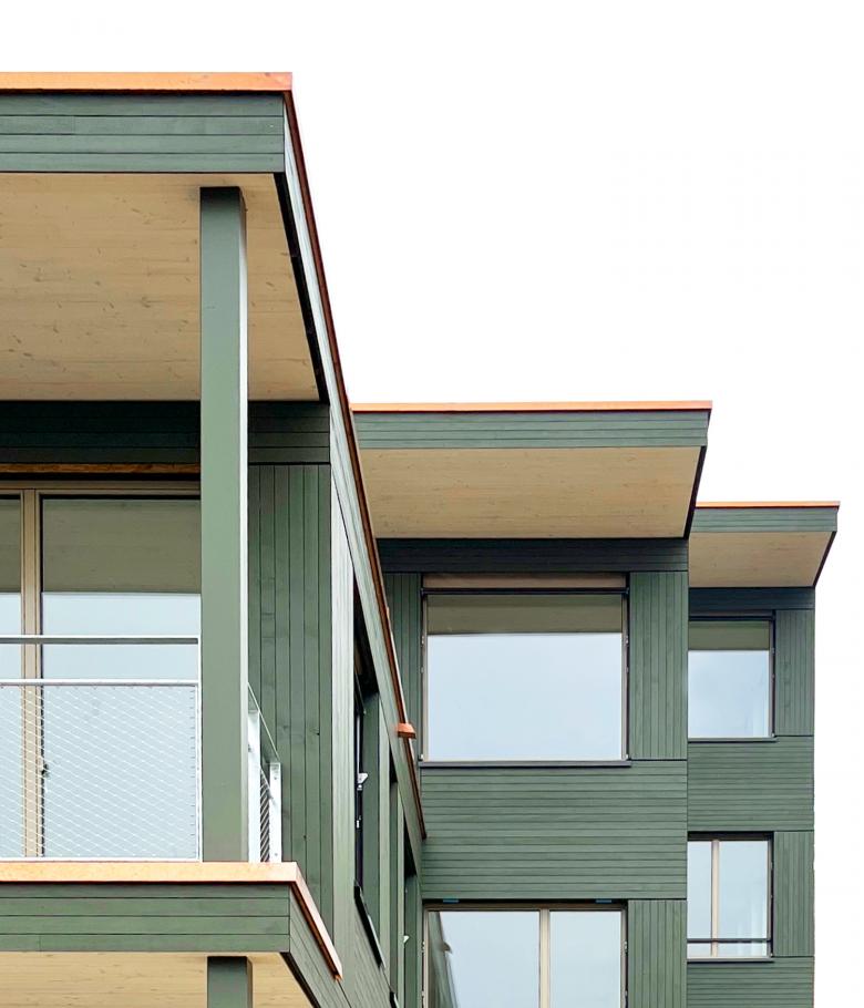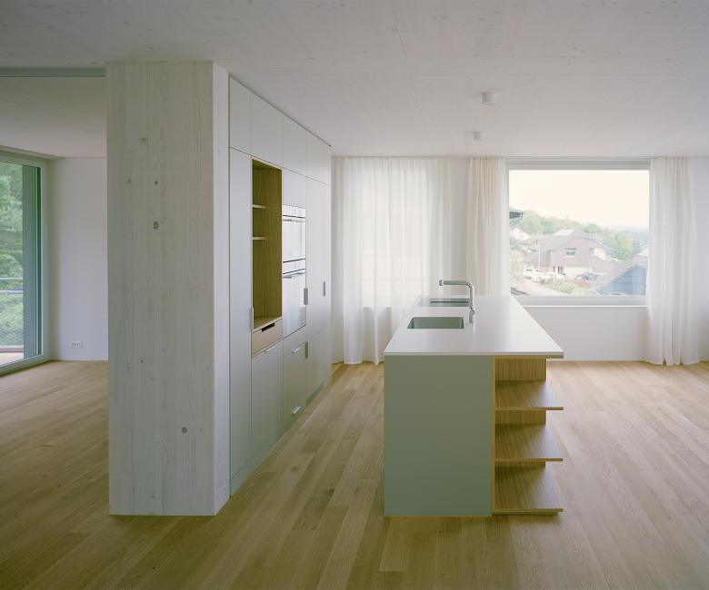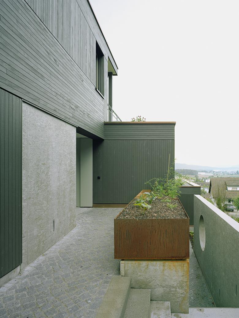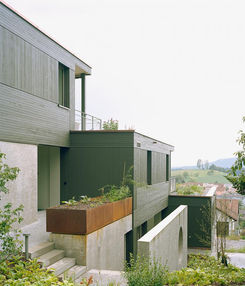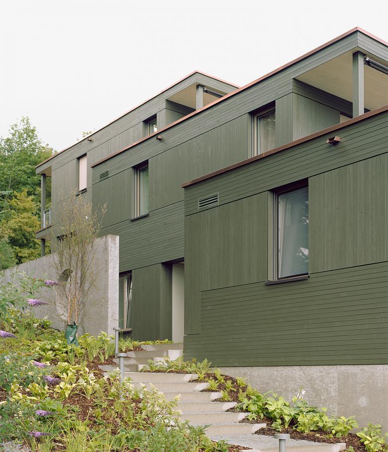 Drei klar strukturierte, zweigeschossige Baukörper– gegen Norden jeweils versetzt– werden in den leicht geneigten Hang situiert. Durch die horizontale Versetzung der Baukörper, erhält jede Wohnung einen attraktiven Ausblick in den gemeinsamen Garten sowie den Weitblick in den Jura. Bewohnerinnen und Besucher erreichen die Wohnungen über eine aussenliegende Treppenanlage, nordseitig des Hauses. Auf zwei Eingangsplattformen werden jeweils drei Wohnungen erschlossen. Alle Wohneinheiten erhalten grosszügige Aussenräume in Form eines Gartens, Dachgartens oder Balkons. Das Wohnhaus mit unterschiedlich grossen Wohneinheiten ist in vorfabrizierter Holzbauweise mit einer hinterlüfteter Holzfassade konzipiert– und mit Schweizer Holz aus einem nahegelegenen Wald ausgeführt.