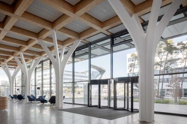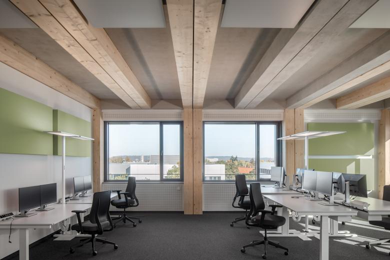 In the form of the research campus, we are designing a heterogeneous, organically evolved industrial district to form a new open and green district. Leafy boulevards flanked by retail and hospitality outlets likewise embrace the new residential quarters created. A large proportion of the existing trees was retained, and we planted new ones to ensure the district was completely greened. Plazas and parks provide places where people can meet, spend their leisure time, and enjoy culture. The office buildings are modular and made using an innovative, sustainable wooden-hybrid method. The key load-bearing components are prefabricated wooden elements in conjunction with reinforced concrete, which shorten construction times and reduce CO2 emissions by about 80 percent compared to conventional construction methods. With its approx. 80,000 square meters of usable surface area, the Siemens Campus is currently the largest wooden-hybrid construction project in Germany. Sustainability and saving resources are key issues of the future and formed the common thread of our design for the Siemens Campus in Erlangen. We believe that preserving existing buildings and prioritizing innovative construction methods are among the most important aspects of sustainability. We plan robust buildings that are flexible. As a result, different usages are becoming ever more a matter of course.