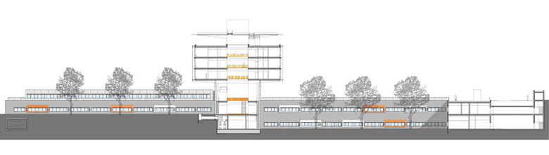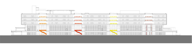 The Surgical Clinic has 15 operating theaters, 235 regular care and 80 intensive care beds and is divided into a two to three-story pedestal housing all the functional areas and a “hovering” building, in which the wards are located. Openings in varying colors create a special lighting atmosphere in every patient’s room. Four warm hues, yellow, orange, red, and brown, are part of the design concept and are to be found throughout the building. They ensure a friendly, light ambiance.