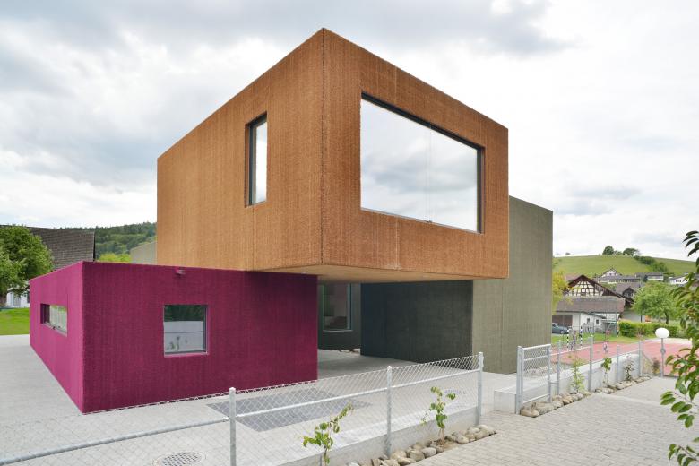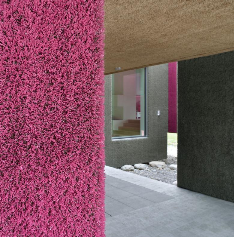 Eine kindgerechte, weiche Fassade aus Kunstrasenteppich fügt sich mit den Farbtönen Strohgold, Rotkraut und Olivgrün natürlich in die ländliche Dorfkernzone ein und animiert zum spielerischen Dialog.