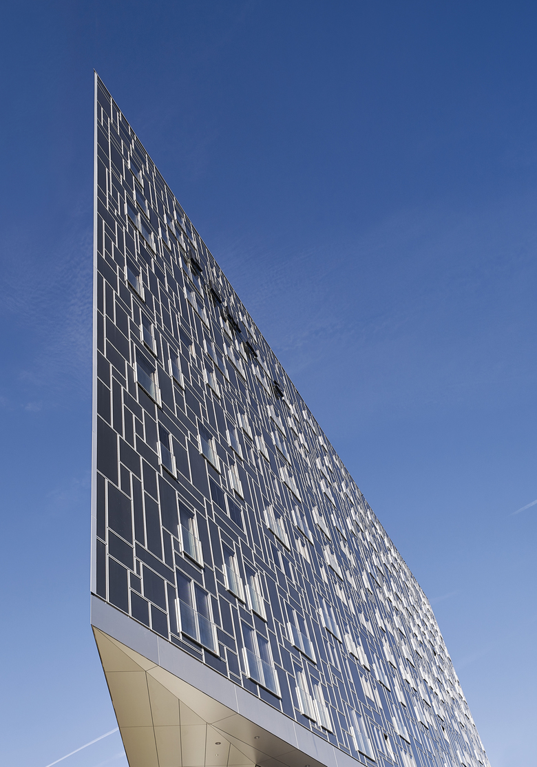 Die Fassade ist eine Adaption einer bewährten Pfosten-Riegel- Systemfassade. Die tragende Konstruktion in Stahlbetonbauweise besteht aus aussteifenden Kernen und Stützenraster.