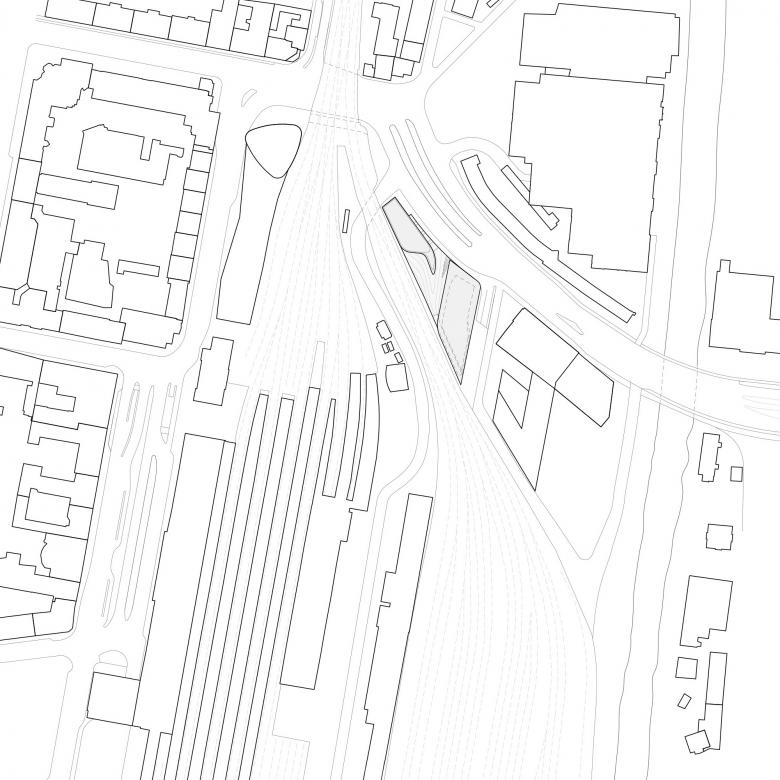 • wurde die Hauptmasse des Bauwerks im Süd-Osten positioniert und berücksichtigt dadurch klar das städtebauliche Konzept des geplanten Stadtteils am Frachtenbahnhof.