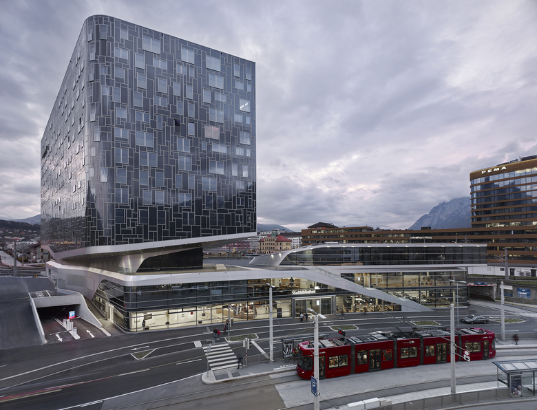 • Die 11 Meter hohe Schaufensterfassade des Retailbereiches folgt konsequent der Flucht der Amraserstrasse in den Stadtteil Pradl und stärkt diese in ihrer Funktion als Hauptverkehrsachse mit durchgängige Erdgeschoss-Attraktivität.