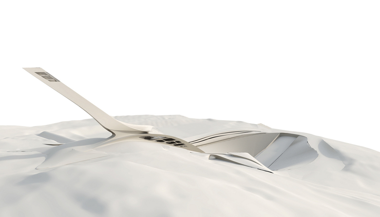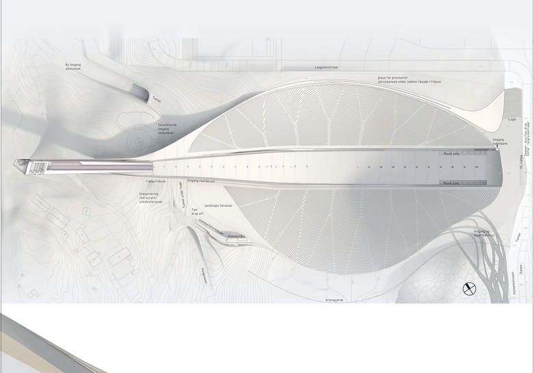 Excerpt of the competition jury: The proposal is characterised by an ”aerodynamic” design, where all the elements fit together in a unified, plastic form of great elegance. In design terms the proposal appears as the competitions most successful. It appears as a refined, highly developed design where the knoll building and the inrun flow into each other in one unified form.The result is a monumental ski arena that grows out of the landscape. The adopted architectural language is consistent and includes the design as a whole, from public flows, commentators boxes, judges towers and stands...