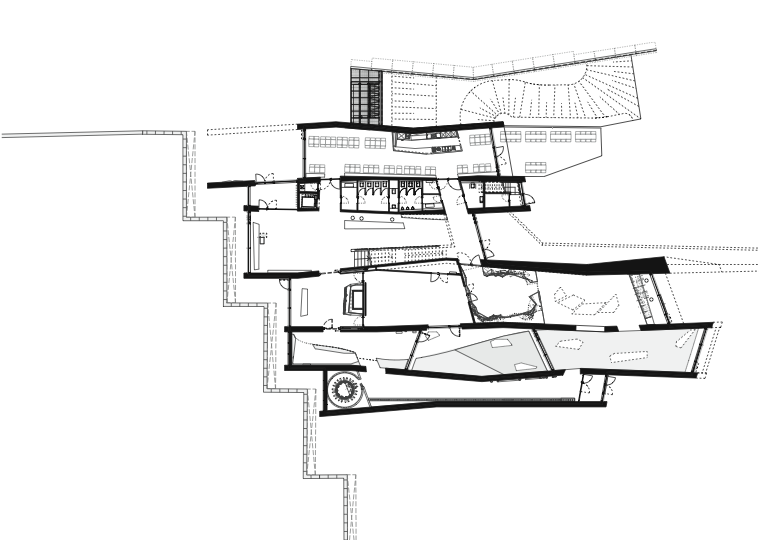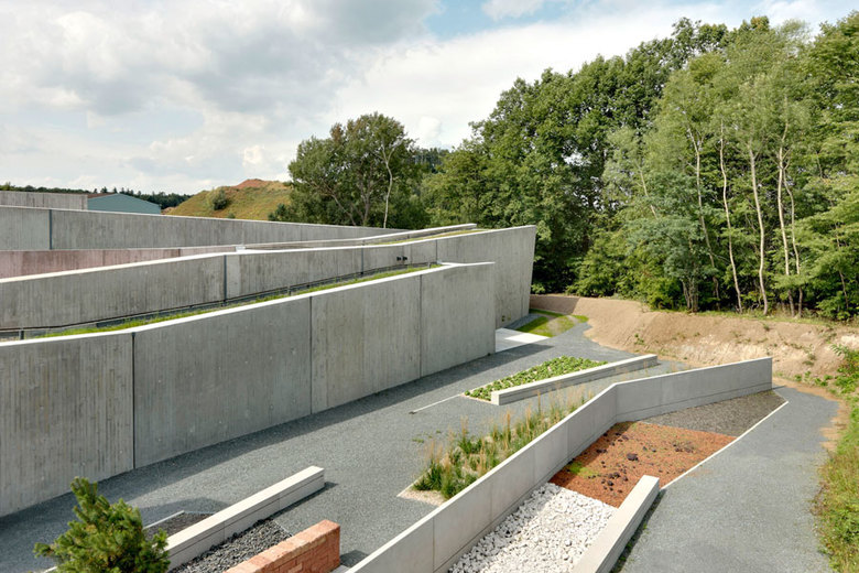 The stratification of the oil shale as genius loci forms the basic graphical idea of the building design. Like an earthen clod, the building breaks loose of the existing angular retaining walls and, with its significant monolithic wall panels, is oriented towards the pit – the actual highlight of the place. This movement culminates in the overhanging observation platform, from which one has an overview of the research site. The visitor symbolically wanders through the Earth’s strata and enters a unique spatial structure that offers no analogy to conventional building types.