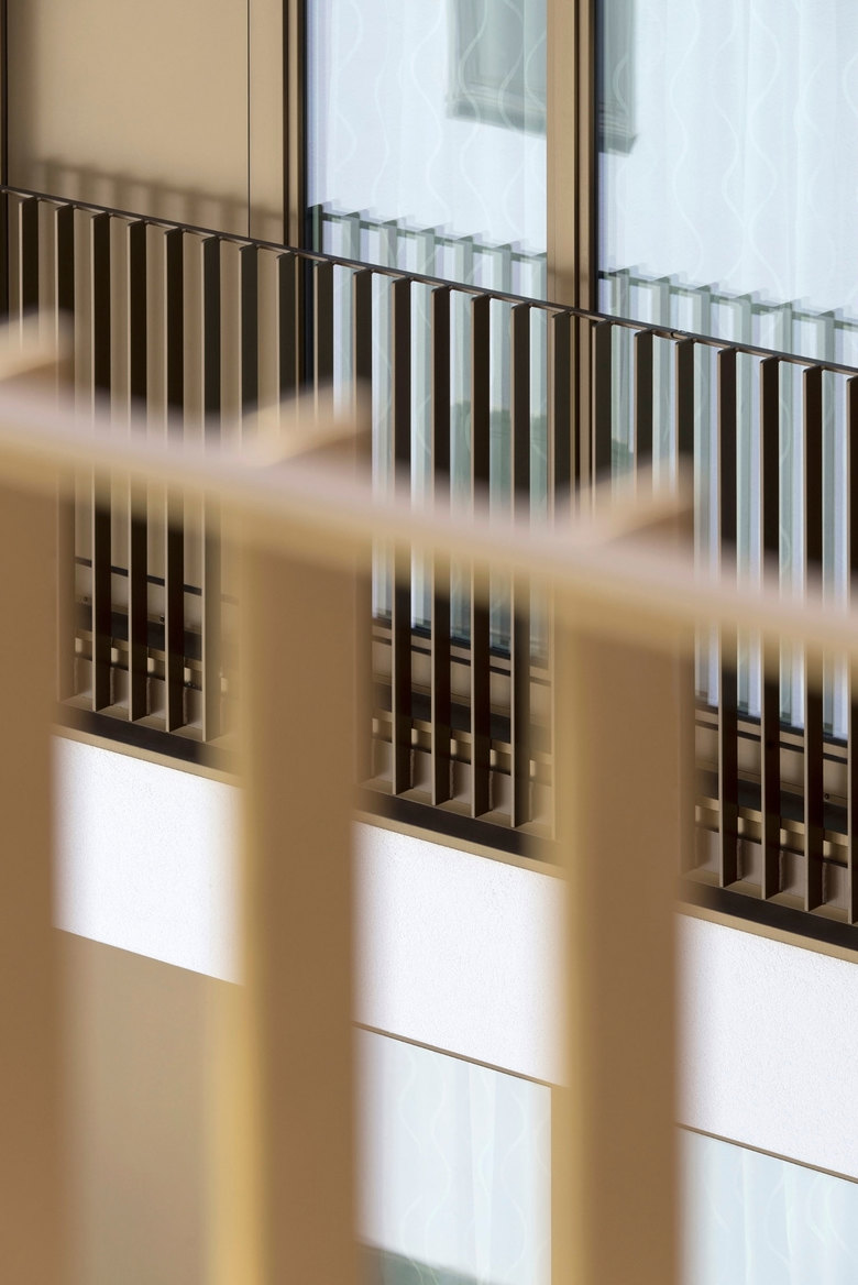 Die Fassade gliedert sich in die geschosshohe Glasfront des Ladengeschäfts als überhöhten Sockel und eine klassische Bandfassade für die Wohnebenen. Raumhohe Öffnungselemente in Kombination mit geschlossenen Metallpaneelen prägen das äußere Erscheinungsbild des Gebäudes. Die durchgehenden Fensterbänder erlauben die gewünschte Flexibilität für die Aufteilung der Wohnräume. Die klare Farbpalette aus weißem Putz, bronzefarbenen Paneelen und Fensterrahmen sowie dem farblich abgestimmten textilen Sonnenschutz unterstützen die reduzierte Architektur der Bebauung.