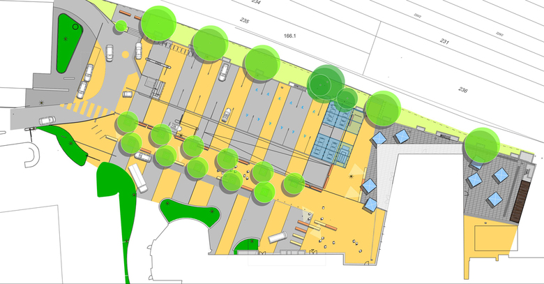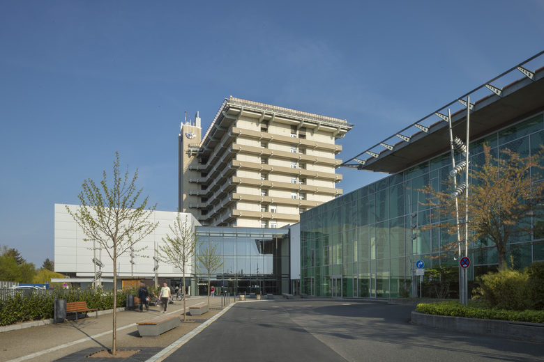 Die Parkierungsanlage wurde erneuert und das Vorfeld am Eingang der Klinik neu gestaltet. Neben Aufenthaltsflächen für die Patienten gibt es Wartebereiche für Gäste, Taxivorfahrt und klinikinterne Bereiche, wie die Liegendvorfahrt für Krankenwägen.