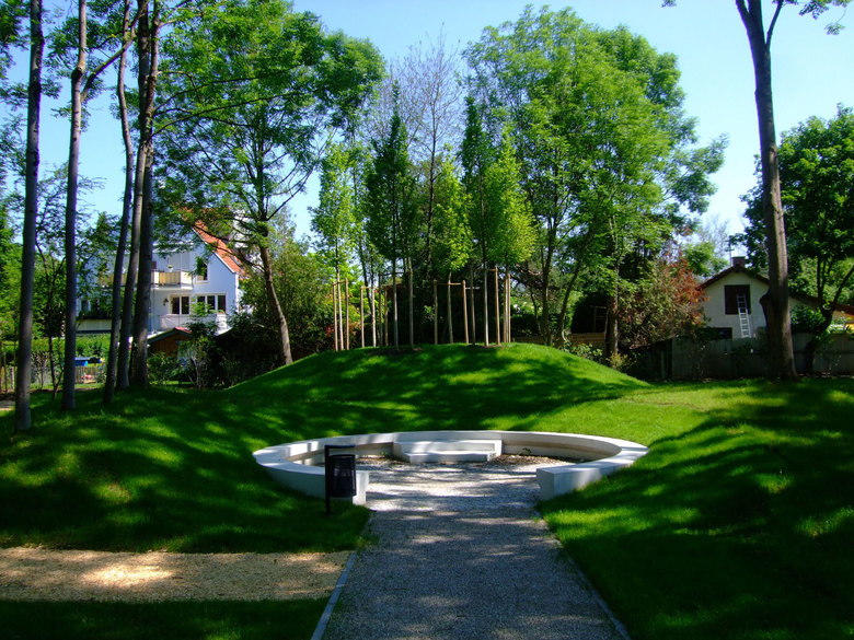 Als neues geometrisches Element, das von der Truderinger Straße aus sichtbar ist, wurde ein Hügel mit einem Kreis aus säulenförmigen Bäumen angelegt, zu dessen Füßen sich ein eine große runde Bank zum Treff für Erwachsene befindet. Insgesamt wird erwartet, das der Anger einwächst und wieder etwas von seinem verwunschenem Charakter bekommt.