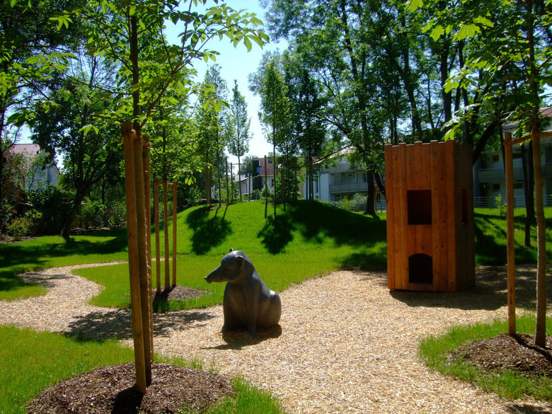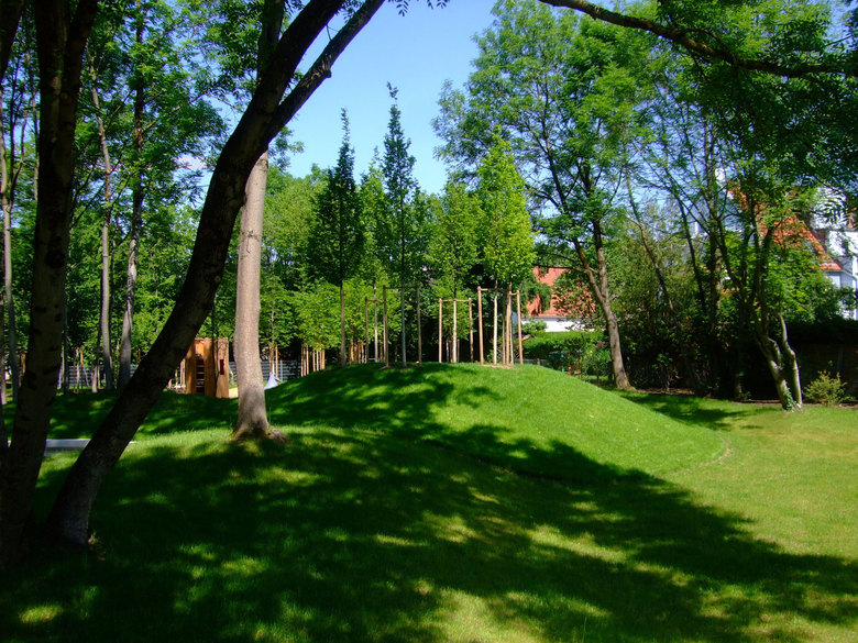 Unter Schonung und Entwicklung des Baumbestandes wird hauptsächlich das Ziel verfolgt hier eine Grünoase für naturnahes Kinderspiel anzulegen. Auf Grundlage der vorhandenen Topografie wurde eine sanfte Modellierung vorgenommen, die zum Tollen und Spielen für kleinere Kinder anregen soll und im Winter bei Schnee rodeln in bescheidenem Rahmen ermöglicht. Neben unterschiedlichen Spielmaterialien wie Sand und Holzhäcksel wurden ein Kletterturm und vier mannshohe Spieltiere aus farbigem Beton aufgestellt: ein schlafender Fuchs, ein schnüffelnder Igel, ein sitzendes Wildschwein und ein Hase, der auf den Hinterläufen steht. Jedes der Tiere, das zu Rollenspiel anregen soll, steht zwischen hainartig gepflanzten unterschiedlichen Kleinbäumen und Großsträuchern. Die Figuren sind Unikate, die speziell für diesen Ort angefertigt wurden.