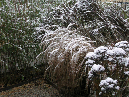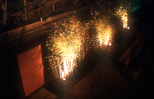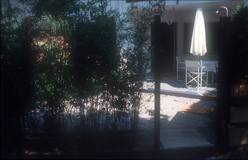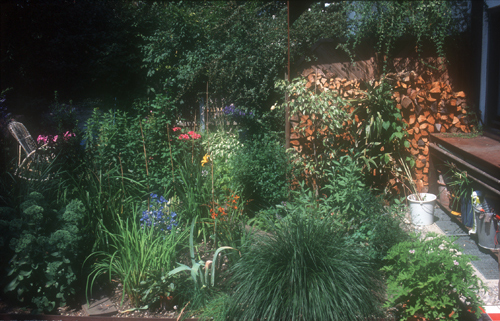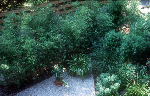 Der kleine Garten wird als Gartenhof angelegt. Der Terrasse vorgelagert ist eine Kiesfläche, auf der im Sommer die Kübelpflanzen stehen und die ca. 50% des Gartens einnimmt. Die andere Hälfte wurde als Staudenbeet angelegt. Zum Wohnweg hin sorgt eine Bambushecke für Sichtschutz.