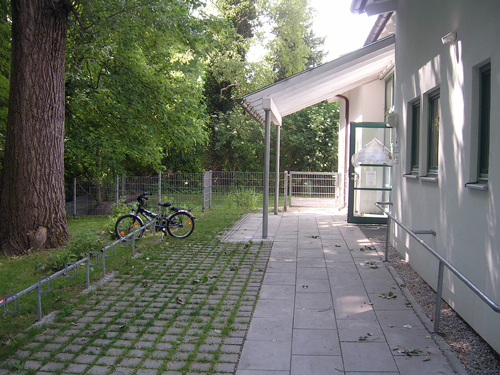 Das Grundstück liegt direkt am Gröbenbach, einer der wenigen prägenden landschaftlichen Strukturen in Gröbenzell. Er war daher für die gesamte Organisation von Freifläche und für die Orientierung des Gebäudes entscheidend. Die Gruppenräume orientieren sich zu der großen Spielwiese im Westen, im Osten am Bach wurde ein Wasserspielplatz angelegt. Das gesamte Dachwasser wird in Pflasterzeilen oberirdisch abgeleitet und versickert.