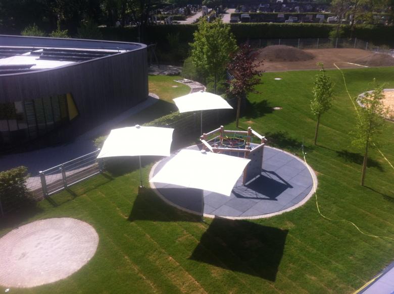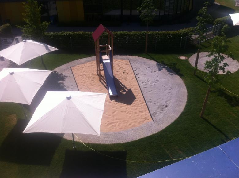 Die Freiflächen sind geprägt durch großzügige Wiesenbereiche, die im Süden modelliert sind. Die Spielgeräte sind bewußt einfach gewählt (Schaukel, Rutsche, Klettergerüst und Hüpfplatten) und formal in "Spielkreisen" angelegt, die auch große Sandspielflächen aufnehmen. Die großzügige Terrasse nach Südwesten dient zum Bobbycar-Fahren.