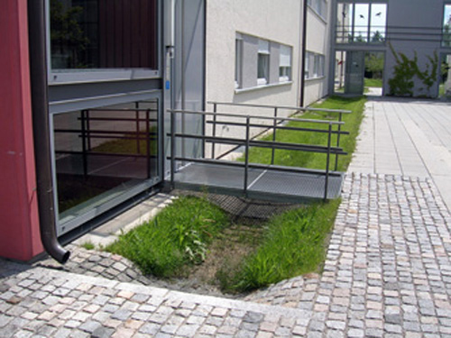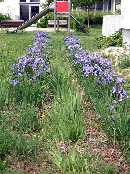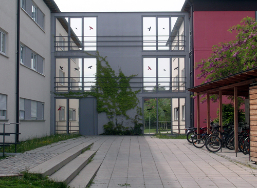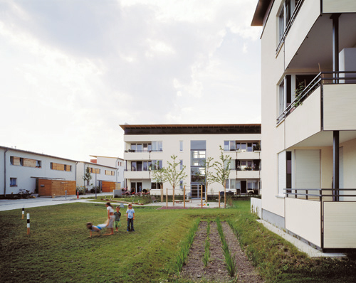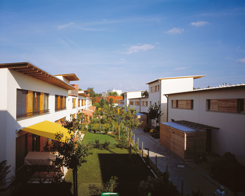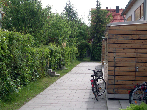 Das Gebiet teilt sich in zwei Bauabschnitte, 36 Reihenhäuser im Süden und 60 Geschoßwohnungen in drei Blöcken im Norden. Die Reihenhäuser besitzen einen schmalen Grundriss und sind mit ihrer breiten Seite nach Süden ausgerichtet, wo ein ca. 6m-tiefer Garten liegt. Wegen des hohen anstehenden Grundwassers wurden die Gärten und Hauszugänge um rd. 60 cm angehoben. Hierdurch entsteht für die Hausgärten ein guter Sichtschutz, der durch berankte Metallspaliere noch verstärkt wird. Die Wohnwege sind für Rettungsfahrzeuge und zum Beliefern zu befahren, ansonsten dulden die Bewohner keinen Verkehr in ihrer Siedlung. Auch die Terrassen der Geschoßwohnungen im Erdgeschoß sind angehoben. Sie sind mit freiwachsenden Hecken eingefasst, die je Hof aus nur einer Art bestehen. In den drei Höfen befinden sich randlich die Spielgeräte mit entsprechenden Sitzmöglichkeiten. Es wurden jeweils große Wiesenbereiche frei gelassen um freies Toben und Ballspiel zu ermöglichen. Das Regenwasser im gesamten Wohngebiet wird oberflächig versickert und ist gestalterisch erlebbar. Bei den Reihenhäusern fließt das Wasser in offenen Rinnen, die die Wohnwege gliedern, vom Regenfallrohr zu einer befahrbaren Rigole. Bei den Geschoßbauten sammeln Gräben entlang der Fassaden das Wasser und führen es zu Sickermulden, die mit Iris bepflanzt sind. Die Verwendung der Baumarten folgt der räumlichen Gliederung: Der Parkplatz ist mit Robinien der Sorte „Casque rouge“ bestanden, die rot blühen, ebenso wie die Kastanien, die den Ost-West verlaufenden Fußweg begleiten. Das rot der Blüten korrespondiert mit den rot abgesetzten Bauteilen der Geschoßbauten. Der zentrale Platz und die Spielplätzchen sind mit Vogelkirschen überstellt, zudem gibt es einen Birkenhain östlich der Reihenhäuser und eine Walnusswiese östlich der Geschoßbauten. Innerhalb der Reihenhaussiedlung stehen Baumhaseln.
