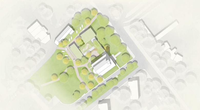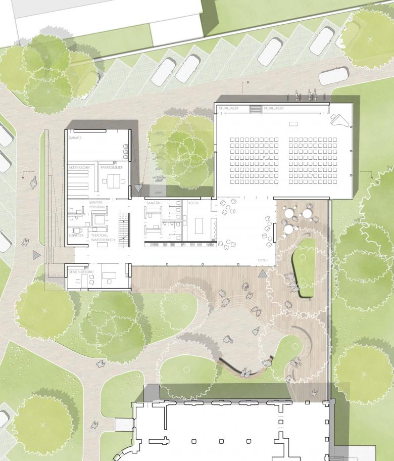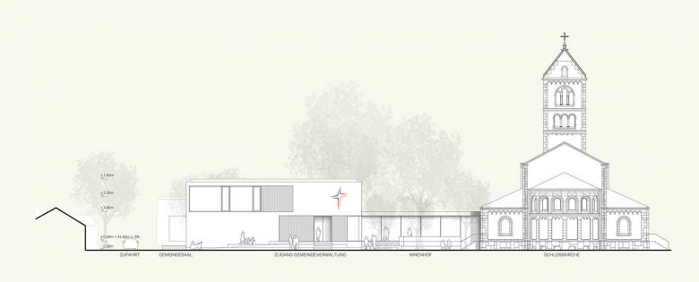Das Gemeindezentrum soll als Gebäudeensemble in enger Beziehung zur Schlosskirche in den Park situiert werden. Hierbei wird besondere Rücksicht auf den vorhandenen Baumbestand genommen, um den qualitätvollen Charakter zu erhalten.