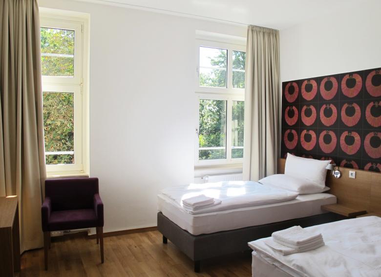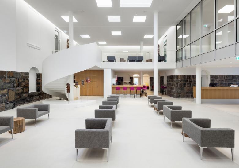 Die zentrale Halle als neue Mitte – Dreh- und Angelpunkt ist die neue, helle Eingangshalle im bisherigen Innenhof des Hauptgebäudes. Sie schafft einen wetterunabhängigen, ganzjährig freundlichen, sonnigen und großzügigen Aufenthaltsraum. Alle Wege und Erschließungen haben hier ihren Ausgangspunkt. Die erste Ebene mit Tagungs- und Seminarräumen ist durch eine großzügige Wendeltreppe verbunden. Der Zugang zu den Gästezimmern in den oberen Etagen erfolgt separat innerhalb des Gästehauses über das bestehende historische Treppenhaus.