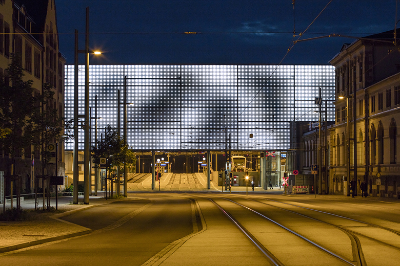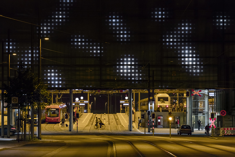 The reconstruction of the main railway station in Chemnitz was intended to combine local and long-distance transport in one building, and to create an entrance to the city that connects itself to urban space in a special way. Swarm Study / IX, stages the renovated main railway station in Chemnitz, Germany, which appears as an interactive LED façade which incorporates the movements of the surrounding and projects them as light movements on the façade. The artists were fascinated by the acrobatic efficiency of birdwings and translate them into this work with monochrome light in a minimalist way. Each individual light source in the façade is brought into collective ‚life‘: when the swarm moves across the surface, each element acts according to its own rules as well as in constant dialogue with its surrounding neighbors.