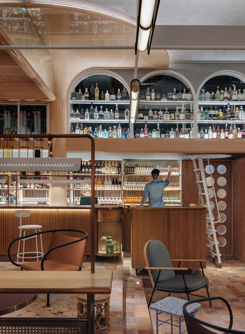 The main dining hall in the restaurant is an interpretation of the storehouses in the docklands. The modern vaulted space plays on verticality, lightness and has a sense of whimsy with circular canopy columns in a dusty pink lacquer and white metal arches surrounded by terracotta render.