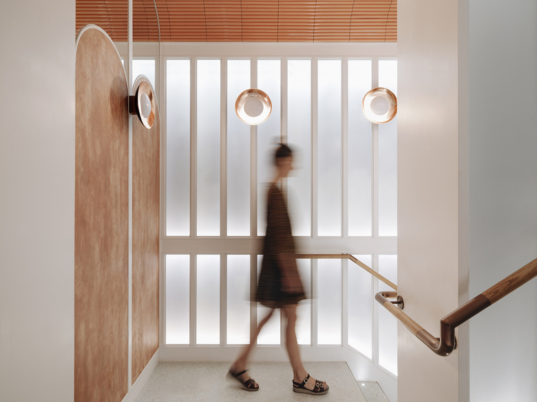 Arriving guests are transported down a vertical staircase of white metal and back lit diffused glass. The entrance captures a glimpse of what is to come: terracotta render walls with a triple height arched ceiling clad in pink tiles, and a lime green terrazzo floor. Infinite reflections of the arches are captured in the high level mirrors.