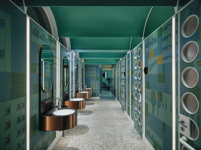The bathrooms reference the spice trade, with a custom laminate in green, mustard, and turquoise framing the space, custom copper mounted vanities, and a green arched ceiling. Recycled plastic tubes line the ceiling of the bathroom stalls.