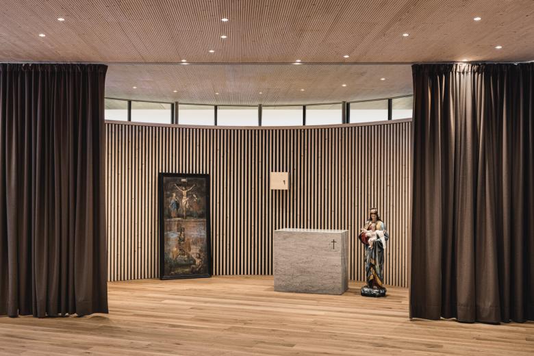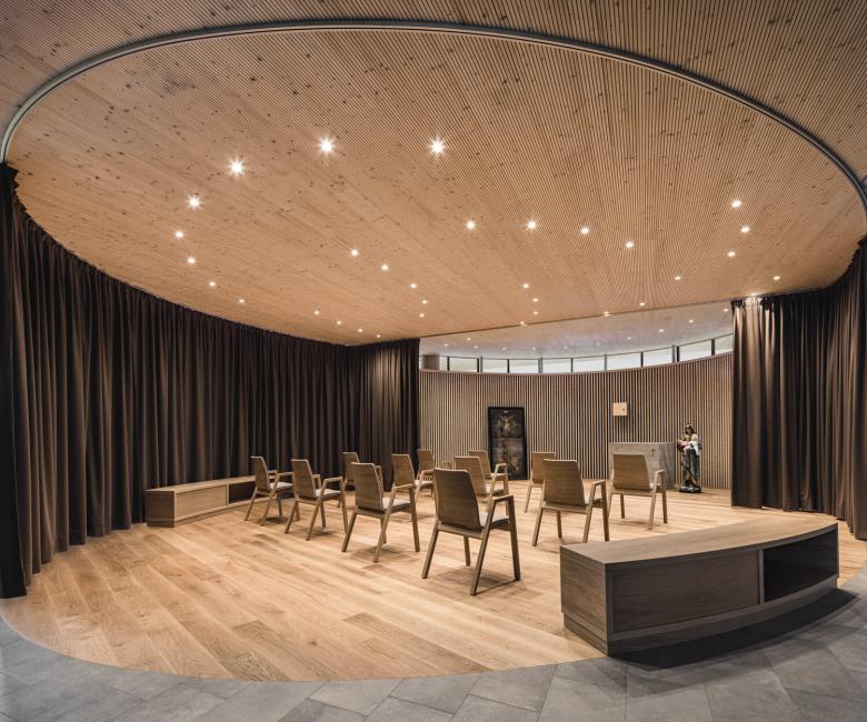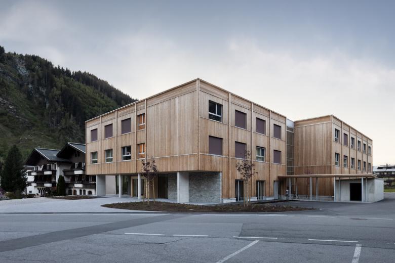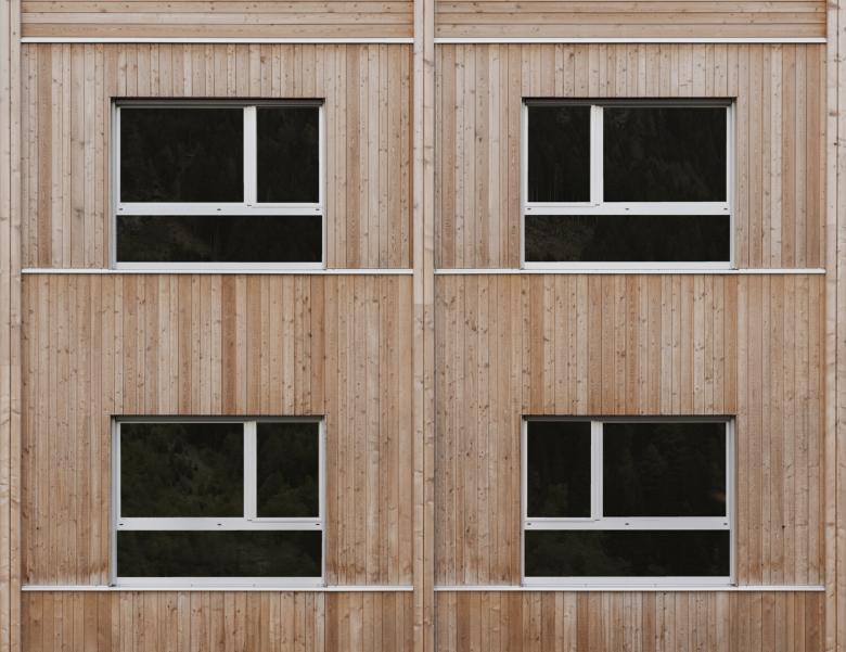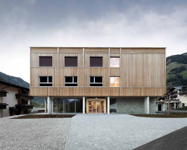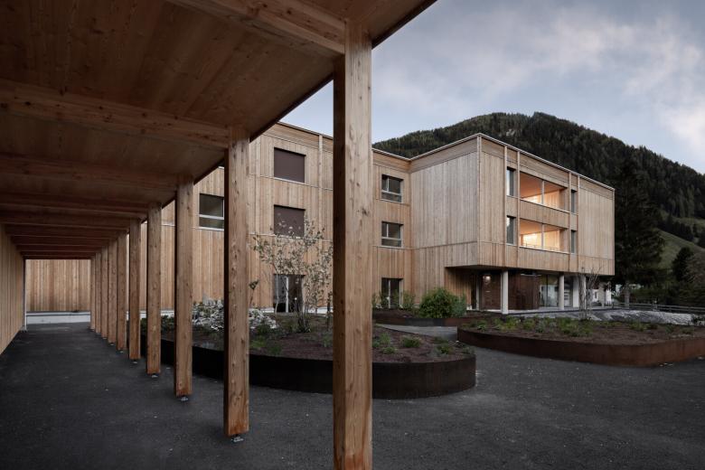 The new building of the individual structures is designed as a constructive wood hybrid structure, the appearance of which with its rough-sawn larch facade creates a reference to the surrounding buildings and landscape.