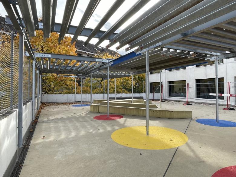 Die Terrassen des gestuften Baukörpers sind im Konzept als Pausen -und Nutzräume für den Unterricht geplant und werden auch so genutzt. Um vor allem in den oberen Geschossen die Nutzungsoptionen aufgrund des Wärmeeintrages zu vergrößern, wurde von Seiten Nutzer:innen ein Projekt zur Beschattung dieser Terrassen angestoßen. Über differenzierte Studien zeigte sich der Vorteil von lamellenartigen, luftdurchspülten und schattenspendenden Elementen, die im Sinne eines klaren Statements durch die Architekt:innen als Re-Use-Elemente definiert wurden. So entsteht eine räumlich präzise Setzung der Schattendächer auf verschiedenen Ebenen auf das mehrfach preisgekrönte Projekt. Gleichzeitig werden zusätzliche Spielangebote geschaffen, die sich unter den neuen Schattendächer entspannt entwickeln können.