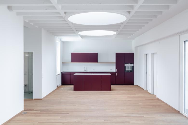 Ein bestehendes Druckereigebäude in der Innenstadt - bestehend aus Fabrikationshalle und Bürotrakt - wird in Wohnnutzung übergeführt. Der durch die industrielle Nutzung bestimmte Charakter des Bestands wird zu einem tragenden Entwurfsthema und wird auch in der neuen Nutzung weiter spürbar sein. Die Direktheit der Tragkonstruktion, Pilzkopfstützen, Rippendecken und Besonderheiten wie die Stahlkonstruktion des Sheddachs werden mit wenigen neuen Elementen und Materialien ergänzt und so neun Loftwohnungen in die Bestandvolumetrie eingeschrieben.