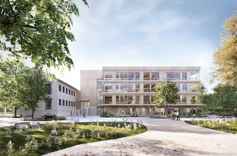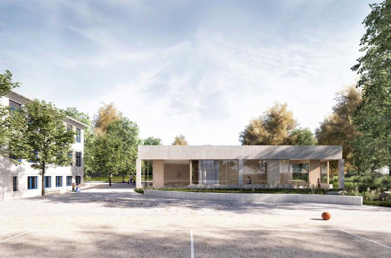Für die Schulanlage Kappeli in Buchs werden zwei neue Baukörper als Erweiterung der Primarschule behutsam auf dem Perimeter platziert. Umspült von einem grosszügigen, zusammenhängenden Freiraum definieren sie gemeinsam mit dem behutsam eingebetteten Bestandsgebäude das bauliche Herzstück der durchgrünten Gesamtanlage und des Quartiers. Während im Norden der viergeschossige Primarneubau direkt an den Bestand andockt und den morphologischen Massstabsprung zur Wohn- und Gewerbezone WG4 aufnimmt, schliesst die Kindertagesstätte in Form eines eingeschossigen Pavillons das Areal zur Tannen- und Kappelistrasse mit ihren moderateren Wohnhäusern ab. Der Projektvorschlag versteht die zentrale Erschliessungsachse, die Volksgartenstrasse, getreu einer Spiel- und Begegnungszone, welche als gedehnte Pausenfläche der eigentlichen Schule den öffentlichen Spielplatz an- und einbindet. Indem sich die Grenzen innerhalb des Gestaltungsperimeters verwässern, gewinnt die autofreie „Volksgartenstrasse“ bedingt durch ihre Lage an Bedeutung.