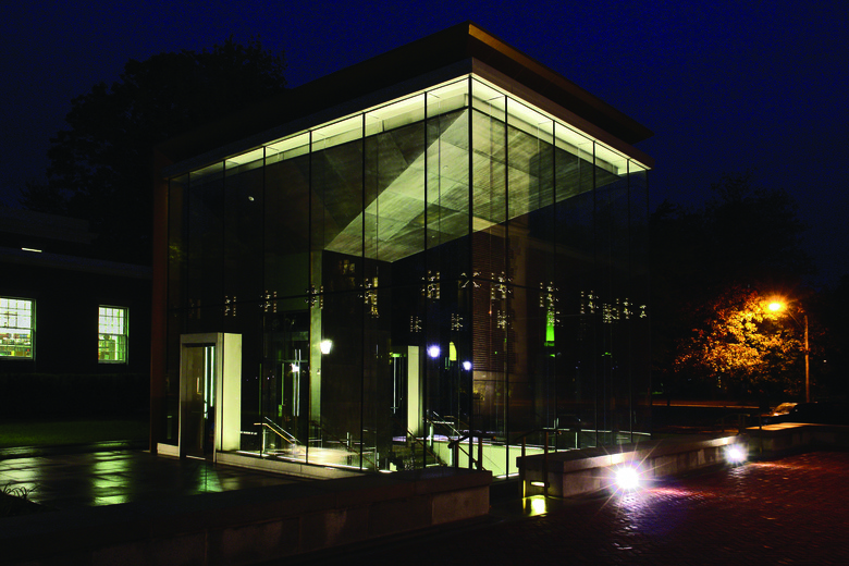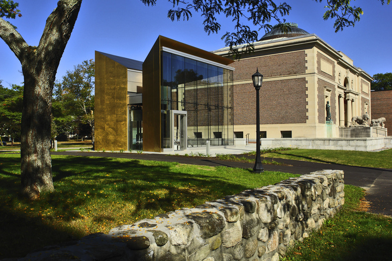 The design addresses new program needs, necessary code and accessibility upgrades and incorporates state of the art security and climate control systems to meet current museum standards. A dramatic glass, bronze and blackened steel pavilion on the south side of the original building provides a new entry to the expanded museum from the town of Brunswick to the West, and the Bowdoin College quad to the East. This six hundred square foot pavilion houses a gracious new steel and stone stair and glass elevator which lead down to visitor service spaces and a new lower level gallery entrance.
