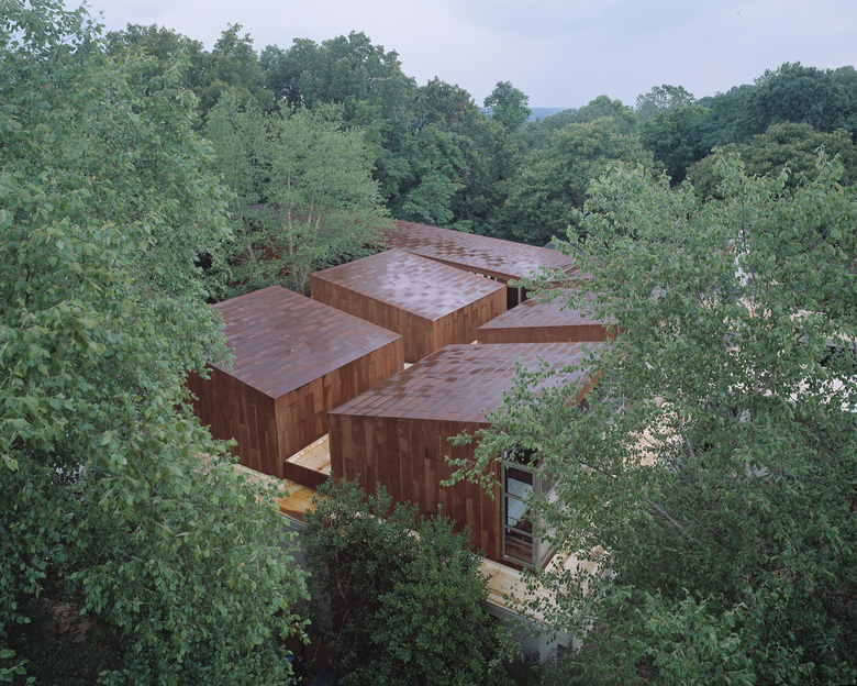 Concrete block piers articulate the corners of each existing space and over time have settled differently, leaving few plumb surfaces to work from. Our tactic was to float cherry and walnut veneer panels over the pier walls and along the ceiling forming a detached interior skin. Flooring of rift-sawn cherry and walnut also act to form an interior liner. Taut and highly crafted, this refined surface acts as an interior liner to the exterior monitors clad in weathering steel shingles. There is a quiet resonance between old and new spaces, enveloped in the warmth of various American hardwoods - they combine for a new material presence that softens their differences.