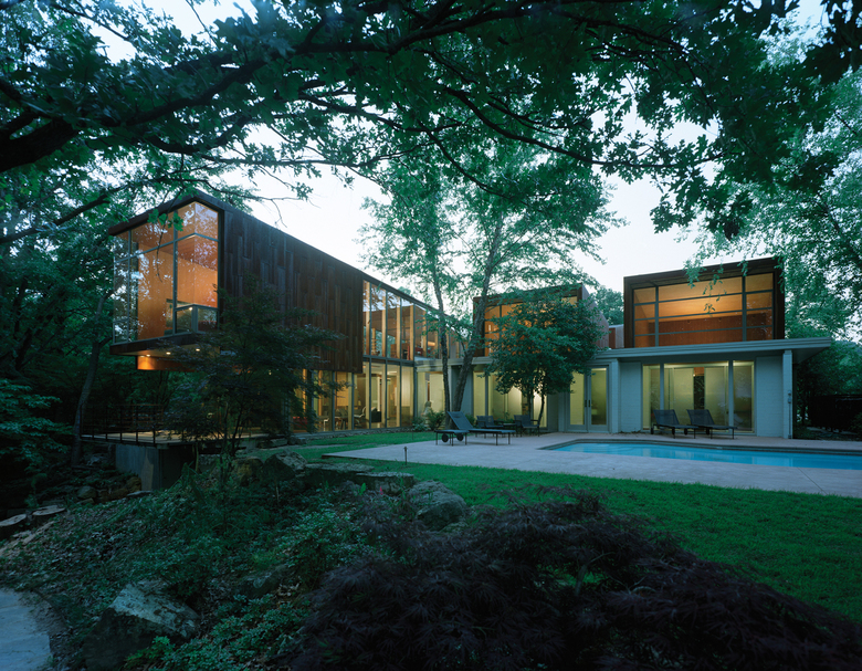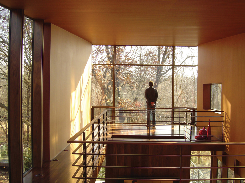 The low-slung existing tartan grid structure, with traces of both Kahn and Wright, was instilled with a new sense of hierarchy through the addition of light monitors and suspended lofts to the children’s spaces, a new kitchen, and a great room with a saddle-back roof for living, entertaining, and the display of fine art. Vertically oriented monitors bring much-needed light through steel windows into the once gloomy interiors most damaged by fire. The great room is naturally lit from all sides and fills the center of the house with light and views to the sky and adjacent monitors above. With two children at one end of the house and their father at the other end, the great room is positioned to unite the family in one grand social space. The room cuts across the non-directional grid of the existing structure providing an enriched and contrasting spatial complexity. At the end of the mezzanine a flying wall - a vertical tableau - appears to float in space, the composition of its rusted metal shingles choreographed to the music of Neil Young and the Band.
