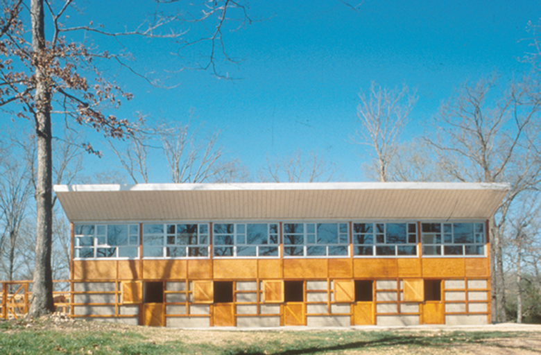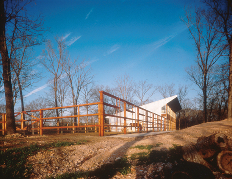 This ”hybrid-house” developed from our observations on how a boundary makes place out of space and how a frame is used to articulate form. The intent was to provide a sense of order; an integrated relationship between coexisting but discrete spatial conditions of artifice and land. High above the Illinois River valley, on a three-sided sloped hill, the BarnHouse, and its open paddock, is intimately linked with the pristine, adjacent forest by a wooden fence, which is a unifying element that provides scale and lateral support for the structure.