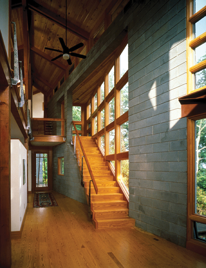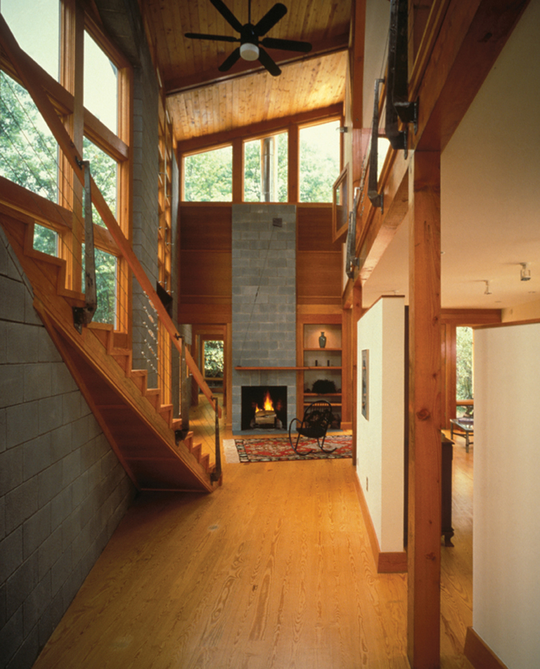 A massive concrete block wall is aligned along the ridge and anchors the structure physically and symbolically—it is a formal edge between the house and the wilderness. The wall edits and reorders the expansive panorama into discrete views, through openings in the wall chosen to highlight particular features of the landscape, compressing distant vistas and figures into the immediate context, perceptually resisting its “pull.” The large opening beneath the perched study tower acts metaphorically as an entry into the landscape. The experience of the expanding landscape, from this vantage point, is echoed in the opening of the interior space into a double-height central space visible upon entry.