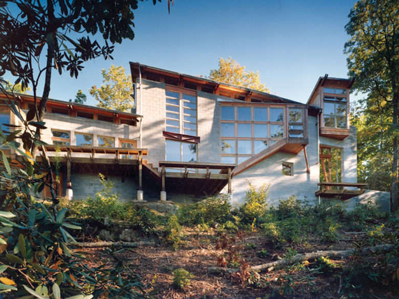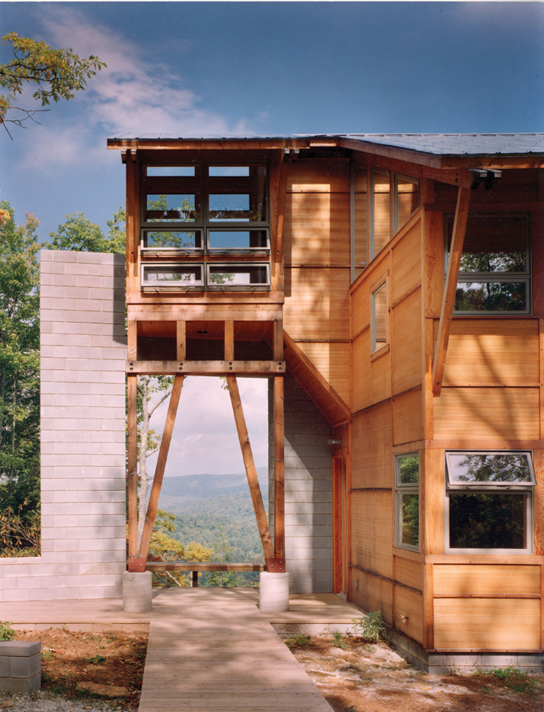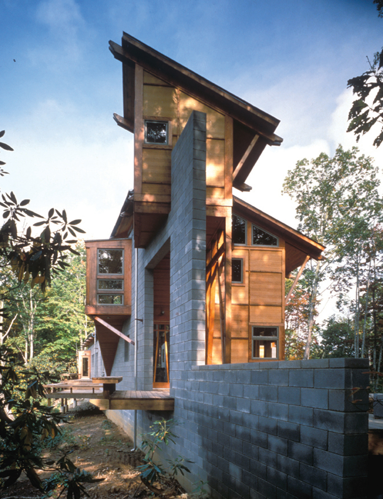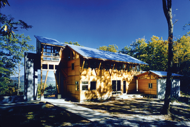 My first residential design was for the late June Moore, an ex-girlfriend’s mother (never burn your bridges). June wanted the house to take advantage of the views of the surrounding landscape and to prioritize privacy. Set between vistas of mountains to the north and woods to the south, the house has two distinct faces. The split-personality scheme is an extension of the parallel yet opposing characteristics of the site and its owner, a politically and fiscally conservative free spirit who drove a Z28 Camaro.