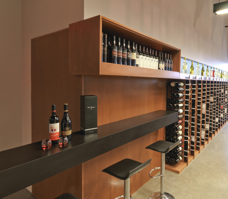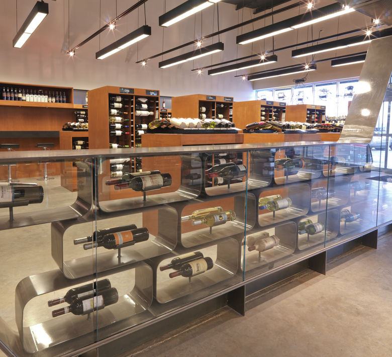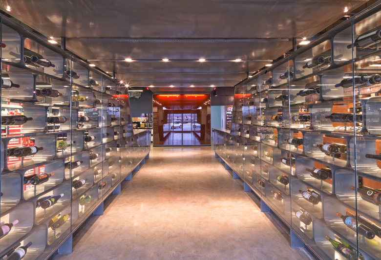 Wedington Liquor provides visitors with an opportunity to transition from the hectic pace of traffic and sprawl outside to a relaxed atmosphere inside. Integrated displays showcase not just a wide array of products, but the beauty and craft of the bottles themselves. An elongated threshold features modules of folded steel plate that each house a pair of wine bottles, along with a folded ceiling plane the evokes the profile of a wine bottle. The entry culminates at a wall of red glass; a wall seemingly filled with rich red wine. An extensive selection of domestic and international wines is housed in custom-designed displays, acknowledging the care and craftsmanship required to produce each wine. Integral seating allows for impromptu wine tastings and encourages the social interaction so often lost in the market today.