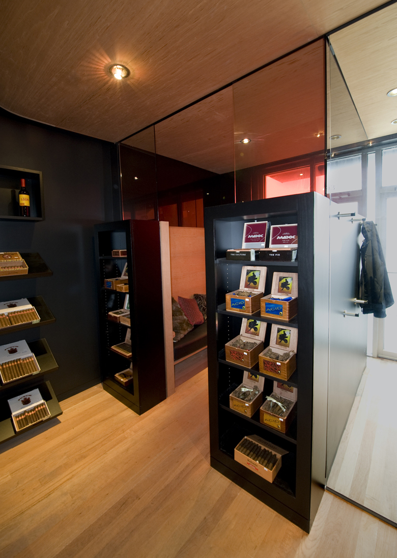 The Wedington Cigar Shop elevates the experience of patrons by immersing them in the rich aroma and tradition of cigars. Rather than being relegated to a small, secondary humidor, the entire space functions as a humidor with cigars on open display. A sensuous wrapper of Spanish cedar lines the floor, rear wall, and ceiling, giving the sense of being inside an exquisite cigar box. Strict temperature and humidity control preserve the delicate nature of the cigars, while providing a rich tactile experience for the visitor. Although housed in a ubiquitous suburban building, the Wedington Cigar Shop provides a detailed respite that is attentive and comfortable.
