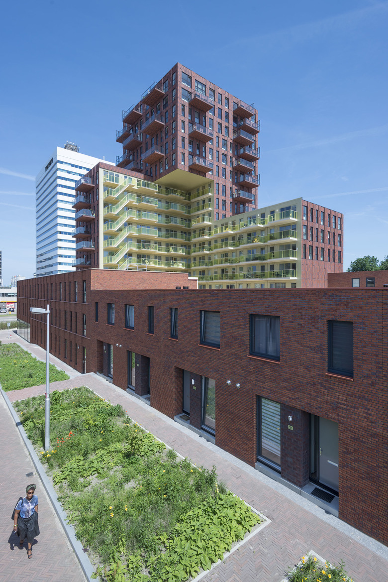 The materials used for the inner facades contrast starkly with the outer facades, enhancing the plasticity of the building. Railings in yellow glass and champagne-coloured frames ensure that, even when the weather isn’t great, De Verkenner still has a sunny and sparkling appearance that radiates throughout the neighbourhood.