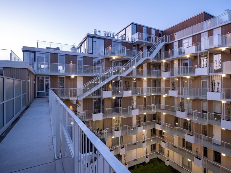 The facade of the volume consists of industrial frames with glazed panels set between them. The repetition of these so-called ‘muse frames’ creates an industrial look with a dockland character. The interior of the volume, by contrast, is an oasis of plants and warm materials that extends across the interior deck and connects with the loft apartments.