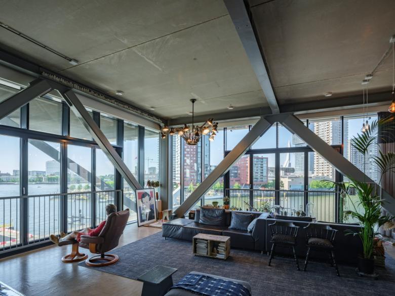 An in-between layer consisting of a gigantic spaceframe structure separates the existing warehouse and new volume above. This middle layer can accommodate either residential or office space. The open portion in this layer offers a magnificent view of the Rijnhaven and the Wilhelminapier. Each loft contains a 2.5-metre-deep outdoor space that extends the full width of the apartment.