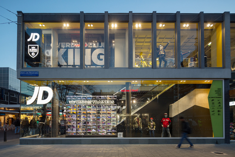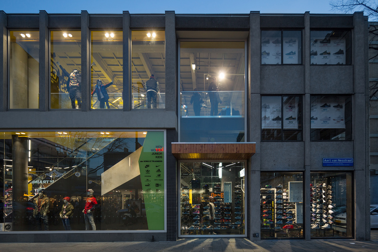 The interior has been modernized by Mei and adjusted to the contemporary retail-standards. The added shed onto the outer facade along the Aert van Nesstraat was removed, after which the authentic and original wooden shed could be restored. The warm and artisanal concrete of the facades was cleaned, and once again suits the current streetscape. The outer façade on the first floor was restored as well, now containing story-high glass panels, opening up the store’s interior to the public.