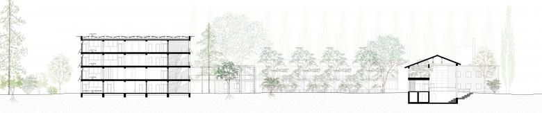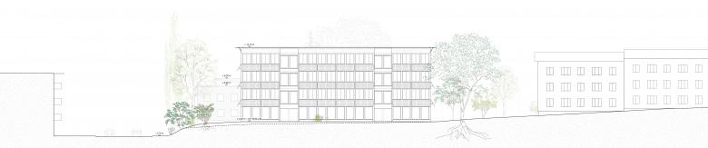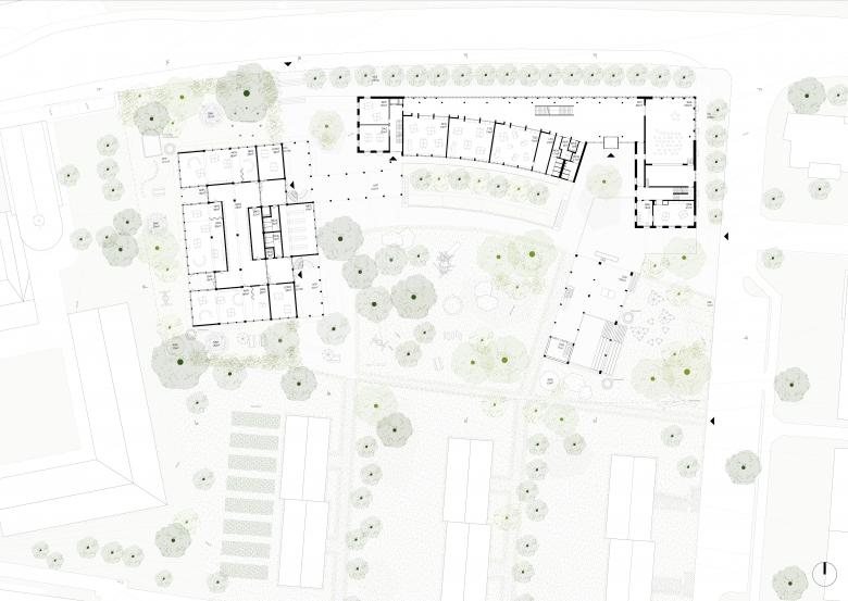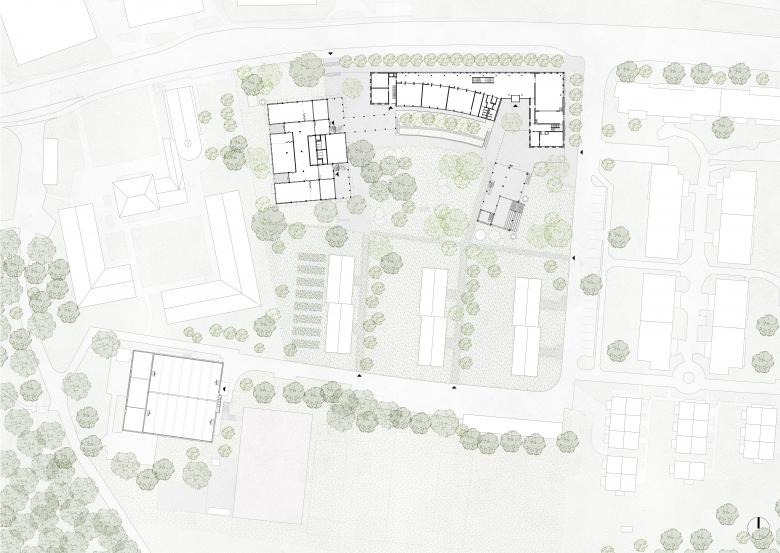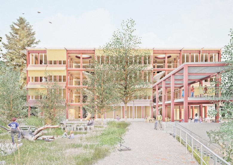 Das Projekt ASSEMBLE ergänzt das bestehende Schulareal mit einem kompakten, viergeschossigen Neubau, der respektvoll zwischen der Mariawil Kapelle und dem schützenswerten Schulhaus von Schnebli, Ammann, Ruchat positioniert wird. Die Setzung bewahrt den wertvollen Baumbestand, stärkt natürliche Kaltluftachsen und schafft identitätsstiftende Freiräume für Schule und Quartier. Das alte Schulhaus wird zum offenen Quartierpavillon transformiert und schafft gedeckte Räume für gemeinschaftliche Nutzung. Der Neubau ist klar strukturiert, dennoch flexibel und ermöglicht diverse Unterrichtsformen durch offene Lernlandschaften. Die Aussenerschliessung bildet mit der gedeckten Verbindung eine Einheit. Ausgestellte Solarbänder und Stoffstoren verleihen den Fassaden eine Tiefenwirkung. Im Vordergrund stehen die Prinzipien der Kreislaufwirtschaft. Materialien aus dem Rückbau werden wiederverwendet und die Konstruktion ist als Holzbau im Sinne von „Design for Disassembly“ konzipiert. Somit bietet das Projekt ökologischen sowie sozialen Mehrwert.