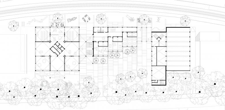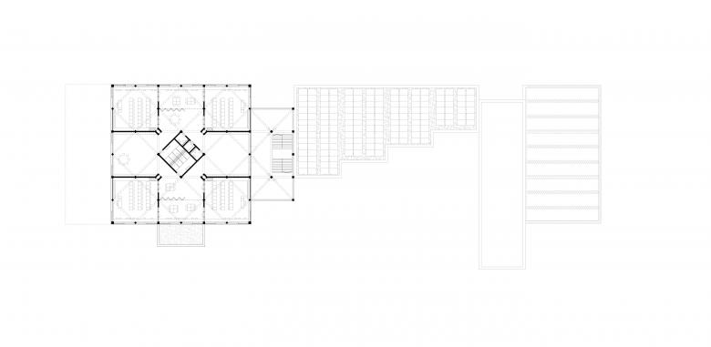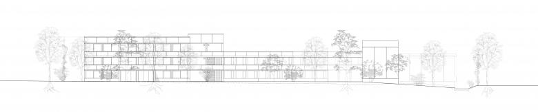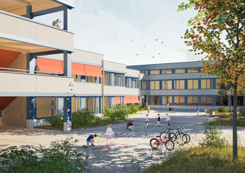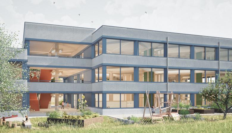 Das Gebäudeensemble der Schulanlage Meierhof wird als Wettbewerbsvorschlag westlich ergänzt durch einen offenen Erschliessungstrakt und einen kompakten Neubau. Die Volumetrie nimmt die charakteristische Staffelung des Bestandes auf, und führt die horizontale Bänderung in der Fassade fort für ein einheitliches Erscheinungsbild. Östlich wird der Bestand mit einem Aulatrakt ergänzt, welcher direkt an die Turnhalle anschliesst. Dieser Eingriff wertet den Pausenplatz auf und gibt Quartiernutzungen Präsenz und Identifikation. Das dreigeschossige neue Schulhaus überzeugt mit seinem offenen Raumkonzept mit flexiblen Lernbereichen, welche Eigenständigkeit und Austausch fördern. Die statische Struktur mit den charakteristischen Doppelstützen und einem Achsraster von 3 Metern verbindet Alt und Neu. Durch das Abdrehen des orthogonalen Systems erzeugen wir eine eigene Identität mit einer sinnlichen Anmutung. Eine ressourcenschonende Bauweise mit Holz und Lehm, und eine Low-Tech-Lüftung senken den Energieverbrauch und schaffen eine zukunftsfähige Lernumgebung.