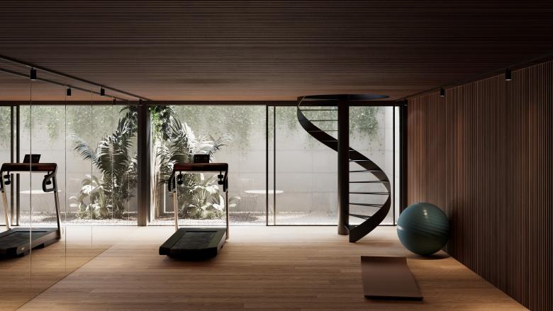 The sleeping area, located on the second floor, offers intimate and serene rooms with natural light and direct views of the garden. The basement houses a bright gym, equipped with a strategically positioned opening that brings in natural light and a connection to the outdoors.