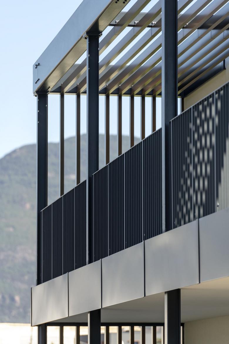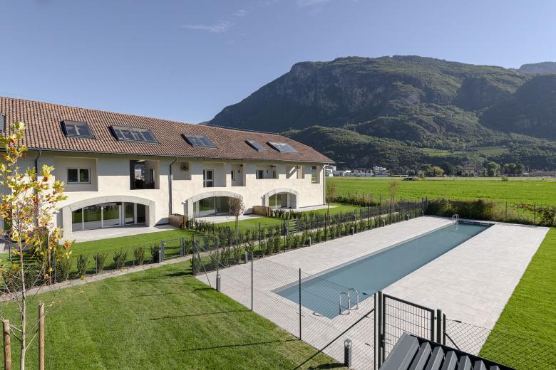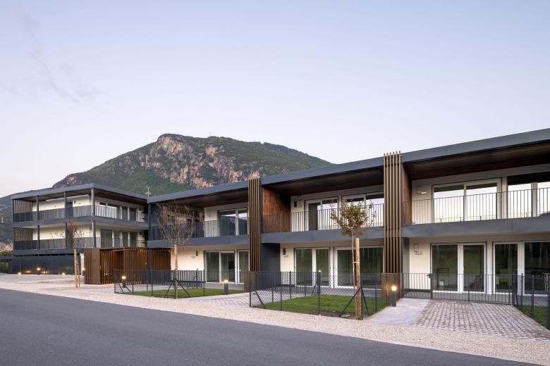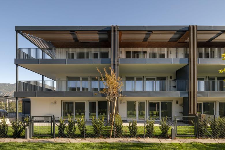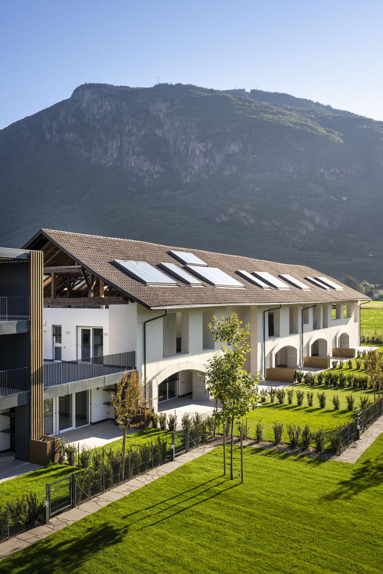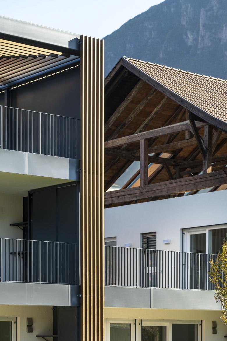 Die beiden Neubauten verkörpern die stilistische Entwicklung, gekennzeichnet durch große Terrassen und eine Fassade, deren Rhythmus durch vertikale bronzefarbene Lamellen durchbrochen wird, welche sich bis zur Überdachung hochziehen und mit der tragenden Struktur aus Brettsperrholz abwechseln. Neben der respektvollen Annäherung zwischen Alt und Neu zielt der Entuwrf darauf ab, das strukturelle Skelett der Gebäude sichtbar zu machen. Durch die Verschmelzung mit der umliegenden Landschaft entsteht ein neues Wohnmodell mit urbanem Feeling in Verbindung mit den umliegenden Apfelwiesen und den Dolomiten. Die Aufwertung dieser Zone reinterpretiert auf zeitgenössische Art und Weise das Zusammenspiel von historischer Erinnerung und smarter Zukunft.