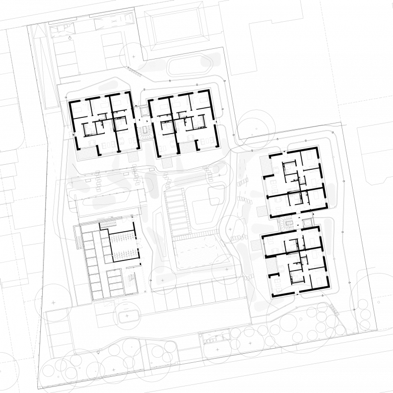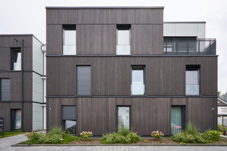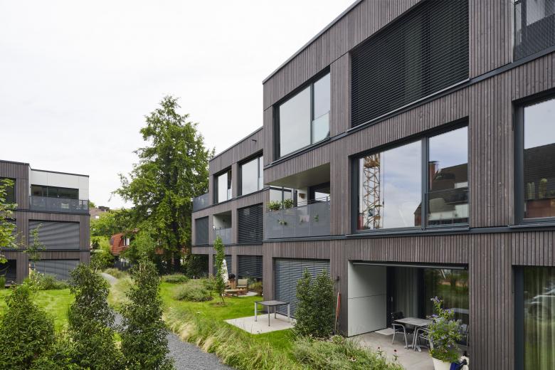 Along with one existing structure, two new apartment buildings - each split into two by a transparent stairway - shape an inviting, green courtyard that serves as a shared community resource. Designed for high energy efficiency, the new buildings feature renewable wood as a primary construction material, which is used both in structural elements as well as façade cladding. Each apartment contains at least one generous terrace or loggia.