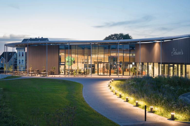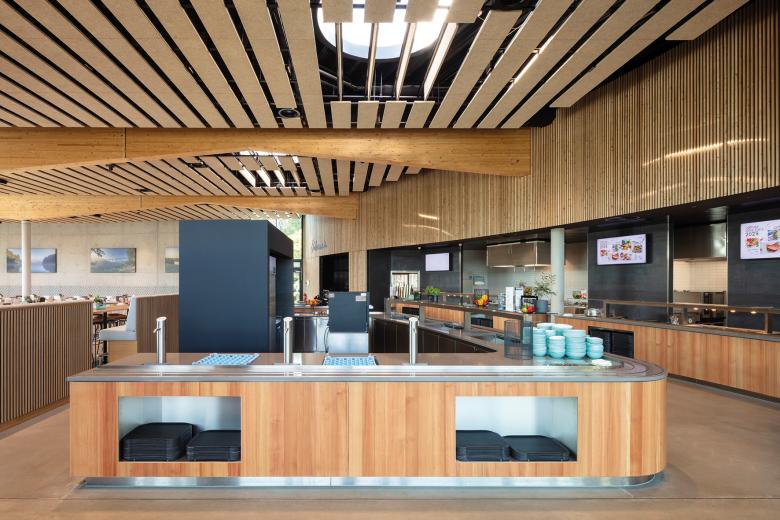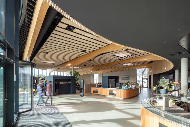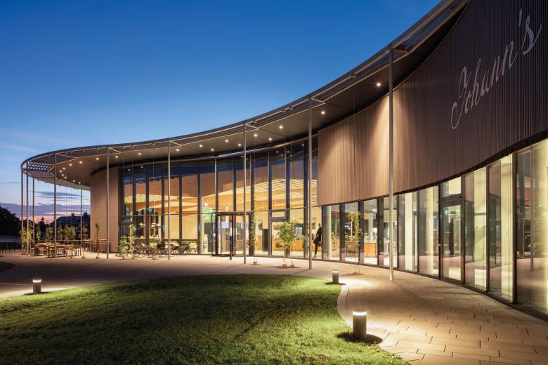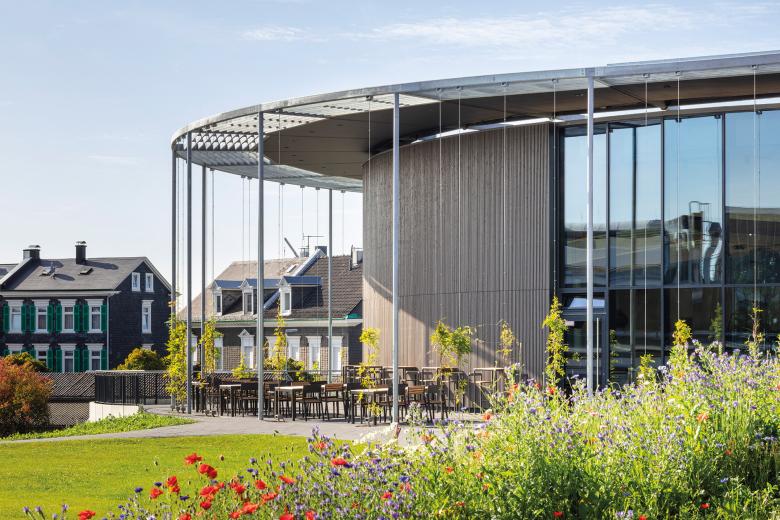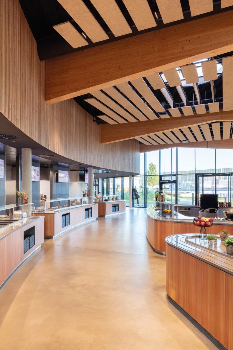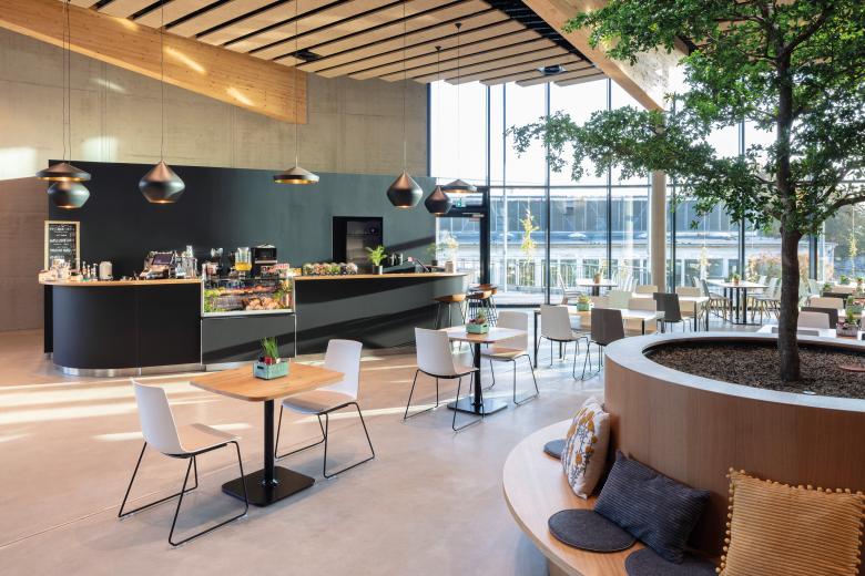 With seating for around 400 people, the restaurant serves around 1,000 meals a day. The successful combination of exposed concrete and wood in the interior of the restaurant offers a high quality of stay. Particularly noteworthy is the fact that the premises can be mechanically ventilated and cooled. The façade of the building is made of wood and the green canopy outside invites you to linger in summer.