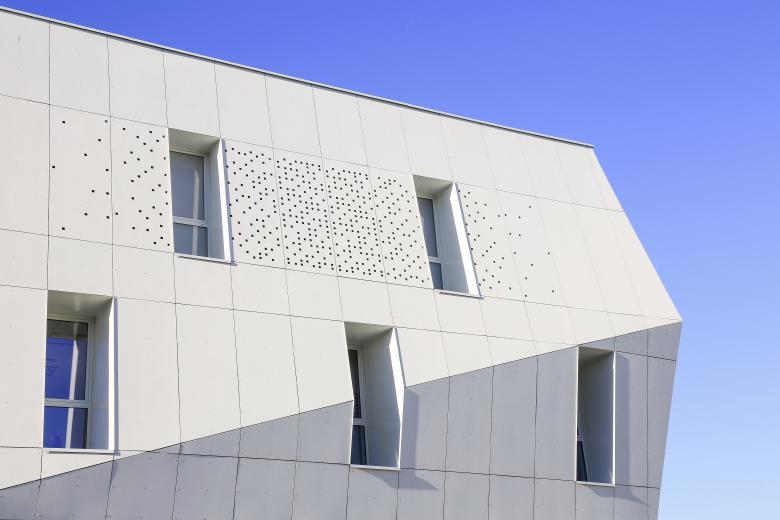 The building opens a double dialogue with the landscape. His position constitutes an envelope with the site, minimizing the incoming nuisances and ensuring a sound protection. The ground floor was treated in a unit way and accommodates the activities of the technical center (workshops, storage spaces). The upper part is the cradle of the offices and the places of life of the municipal staff. The façade is made of Equitone fiber-cement panels which create a double skin. The slope and the perforations of these aim to obtain technical and acoustic performances able to offer comfort to the offices. This device gives the opportunity to create a large terrace linked with spaces of relaxation and restoration and create an accessible and convivial place.