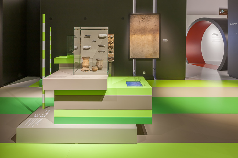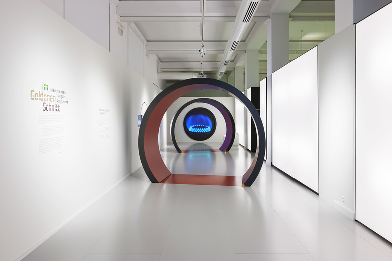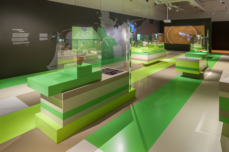 Der Bau der Nordeuropäischen Erdgas-Leitung (NEL) von Lubmin an der Ostseeküste quer durch Norddeutschland bis nach Rehden im Landkreis Diepholz 2011-2012 wurde zur Goldgrube im wahrsten Sinne des Wortes. Die Trasse bildete mit 200 km den längsten archäologischen Grabungsschnitt, den es je in Niedersachsen gab. Höhepunkt der zahlreichen Funde ist der mehr als 3000 Jahre alte Goldschatz von Gessel. Er ist das Kernstück der Ausstellung „Im Goldenen Schnitt – Niedersachsens längste Ausgrabung“. Nachdem der Besucher durch eine inszenierte Pipeline die Ausstellung betreten hat, kann er sich auf dem stilisierten „Grabungsfeld“ an acht Multimedia-Stationen über die Fundplätze und ihre wissenschaftliche Aufarbeitung informieren. Er gelangt dann vorbei an einem scheinbar unter Wasser präsentierten Fund aus der im Greifswalder Bodden gesunkenen Kogge in den glutroten Themenkomplex der Metallverarbeitung. Schließlich erreicht er im dämmrigen Licht den mattgoldenen, polygonalen Hort des schimmernden Schatzes. Die Ausstellung präsentiert die historisch einzigartigen Funde und macht den frühgeschichtlichen Rohstoffim- und –/export sowie seine Erforschung fassbar.