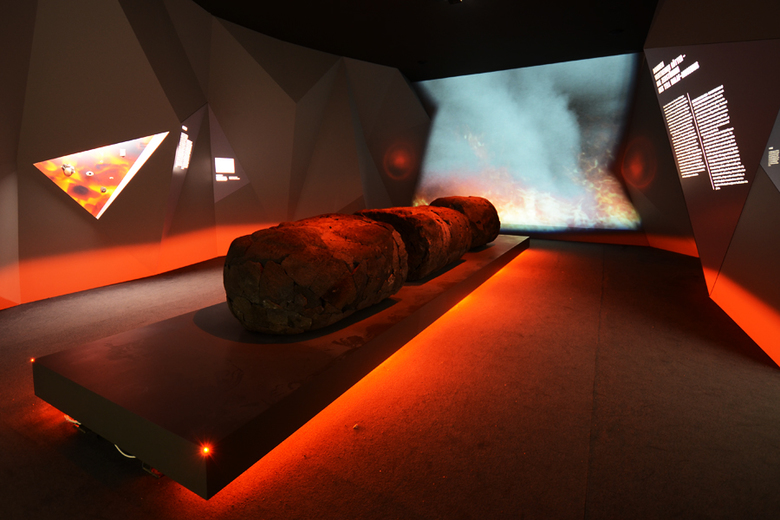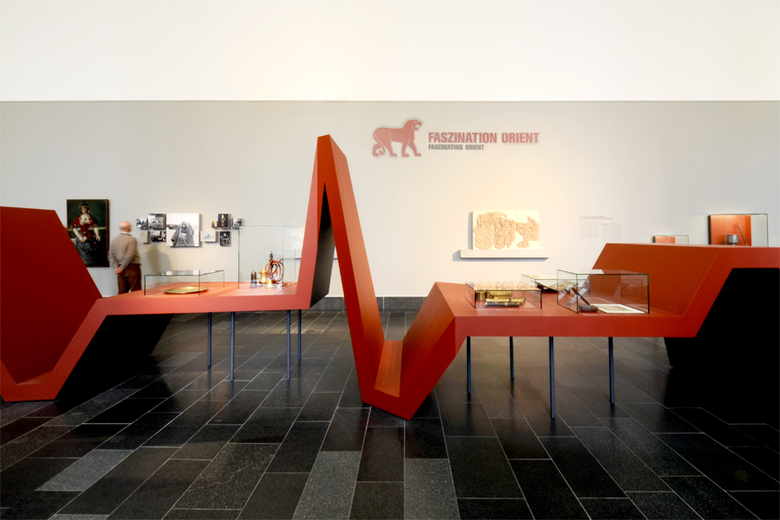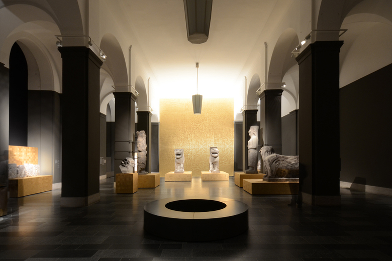 The exhibit acquainted visitors with the original presentation of the archeological discoveries in Max von Oppenheim's museum in Charlottenburg and illustrated, through a moving media display, the destruction of the basalt sculptures in the blazes of WWII. In the restoration room, the visitor experienced the staggering story of the sculptures' reconstruction from their 27,000 fragments. Entering the next room, the large Schlüter Hall of the Pergamon Museum, the visitor was then confronted with the splendid results of the reconstruction effort. The somber gray tones represented the persisting mystery surrounding the sculptures and their destruction; the investigation of which only began with the restoration process. The gold of the background and the pedestals evoked the radiance of the Kapara Palace of Tell Halaf.